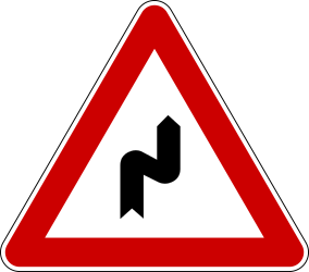 Dieses Verkehrszeichen weist auf eine Warnung vor doppelter Kurve voraus, zuerst nach links, dann nach rechts hin. Es macht Fahrer auf zwei aufeinanderfolgende Kurven aufmerksam, von denen die erste nach links und die zweite nach rechts führt. Fahrer sollten die Geschwindigkeit reduzieren und auf mehrere Richtungsänderungen vorbereitet sein. Bleiben Sie aufmerksam und behalten Sie die Kontrolle, besonders bei schlechtem Wetter oder eingeschränkter Sicht.