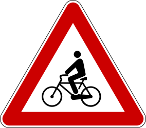 Dieses Verkehrszeichen weist auf eine Warnung vor Radfahrern hin. Es macht aufmerksam auf die Anwesenheit von Radfahrern auf oder nahe der Straße. Fahrer sollten langsamer fahren und mit querenden oder entlangfahrenden Radfahrern rechnen. Teilen Sie sich die Fahrbahn und halten Sie ausreichenden Überholabstand ein. Häufige Standorte: Schulbereiche, Radwege, in der Nähe von Parks, Sportanlagen oder Fahrradstrecken.