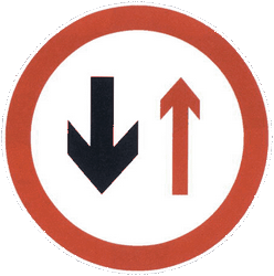 この交通標識はあなたが対向車に道を譲らなければならない道幅の狭小部を示しています。道幅が狭くなっているため、対向車に優先して道を譲る必要があることを示します。通常、2台の車が同時に通れない幅になる場所で使われます。